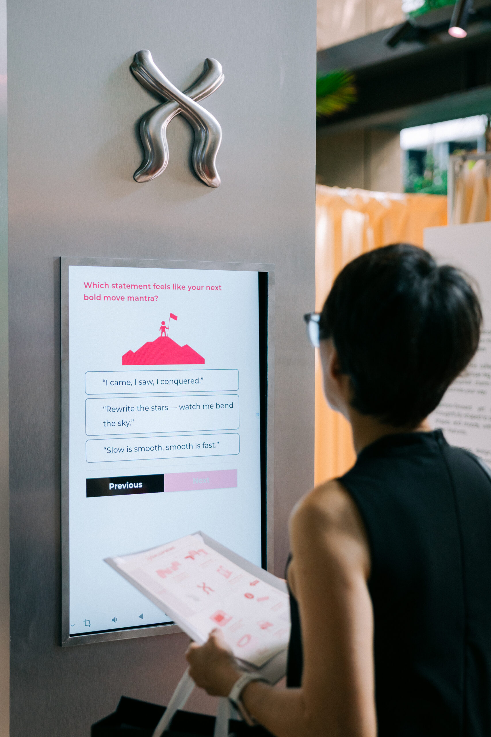 在此,访客还可参与特设环节:“Take What You Need for Your Next Leap”,在“人际关系、成长、事业、生活方式、未知(X)”选项中,选择适合的眼镜风格。