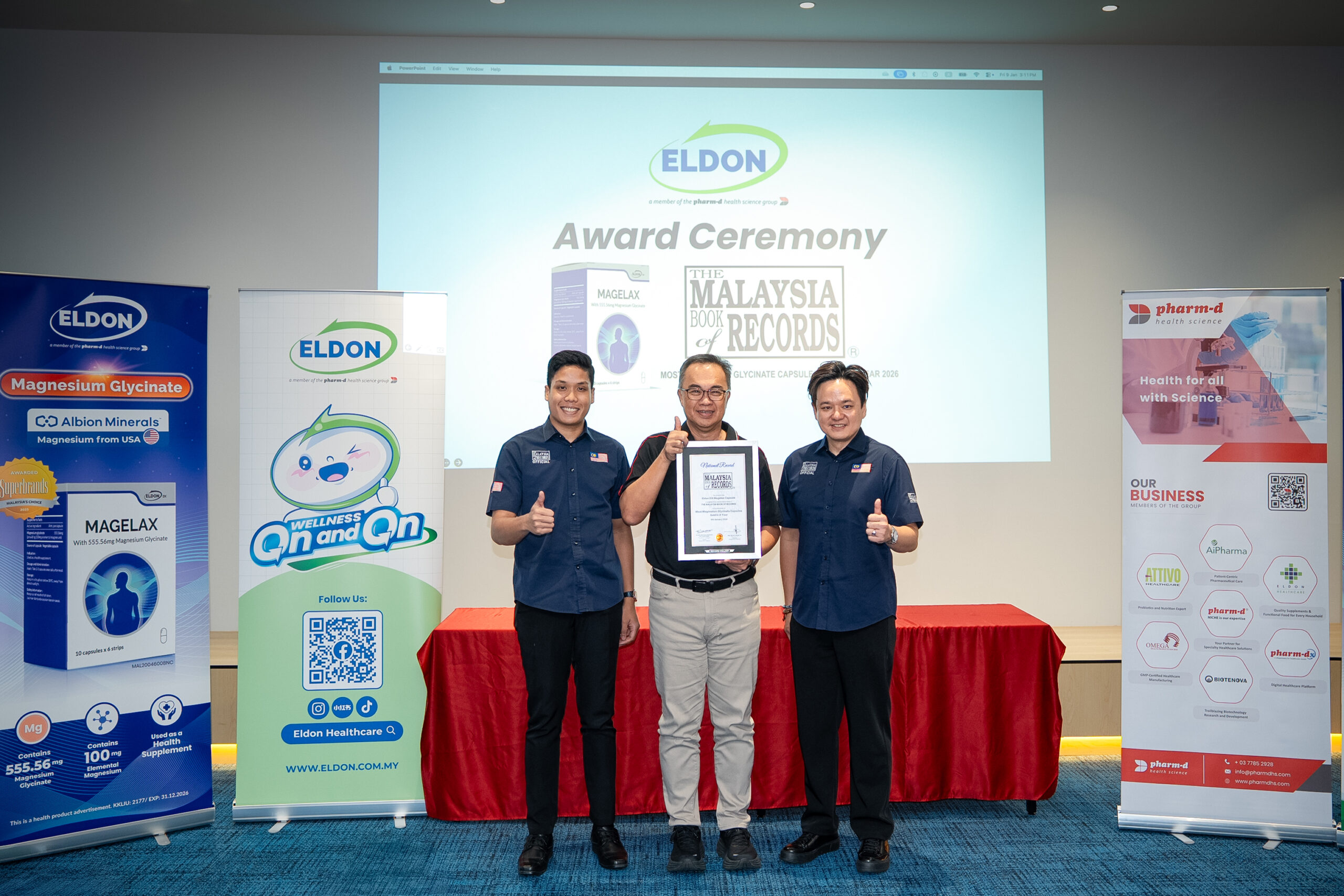 Pharm-D Health Science 集团董事总经理黄振昌先生表示:品牌大使的委任,以及 ELDON DX MAGELAX 获《大马纪录大全》认证,是集团长期发展历程中又一个重要阶段的成果。