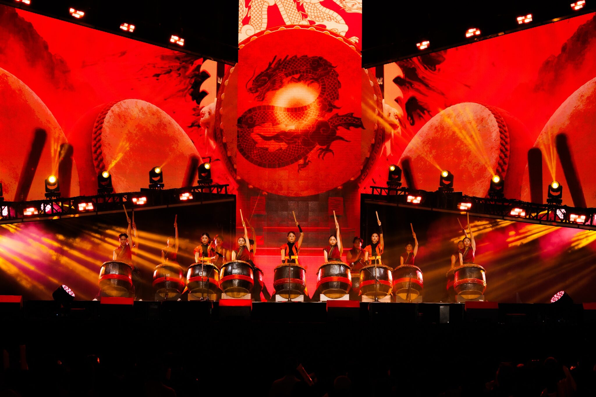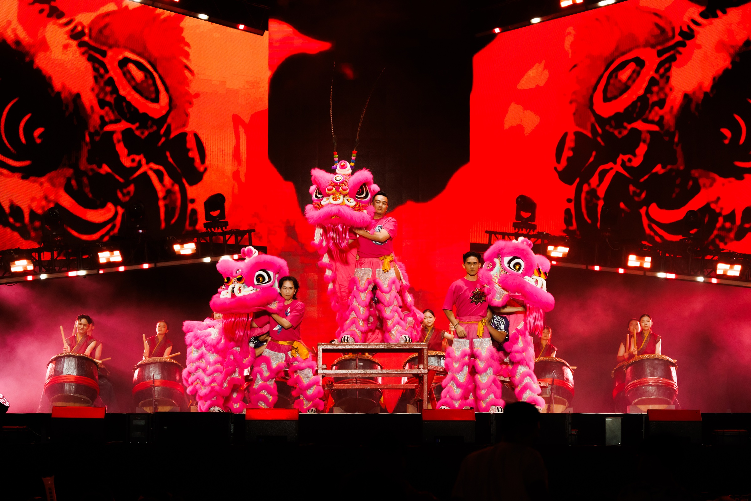 这场新春跨年派对以音乐为核心,融合传统与现代元素,打造多元曲风的新春音乐盛宴。节目一开场便由林德荣、Jack 叶朝明及 Eric 赖宏恩率队舞狮震撼登场,三人一人舞一头舞狮,气势十足,现场共 15 只舞狮同台献艺,场面浩大、热闹非凡。大头 AkiRibbon 黄若熙及 Candy 小潼也以震撼鼓阵助阵,展现巾帼不让须眉的豪迈气势。